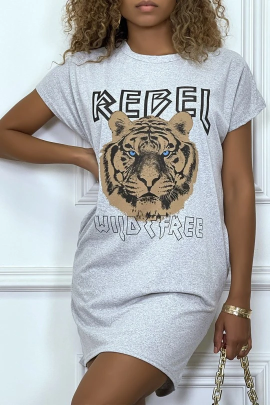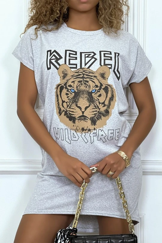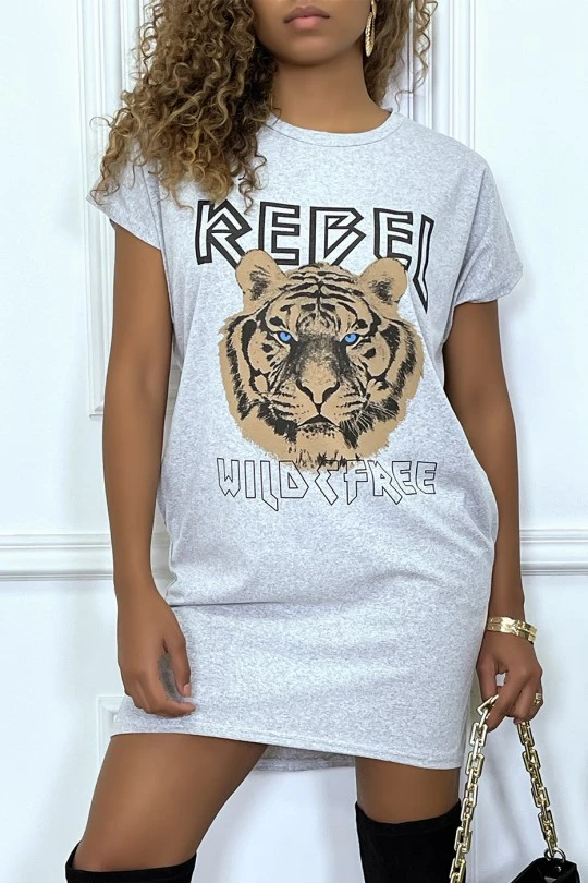 Robe t-shirt gris avec poches et Ă©criture REBEL avec dessin de lion. VĂŞtement femme tendance et pas cher, très agrĂ©able Ă porter pour l’Ă©tĂ©Â