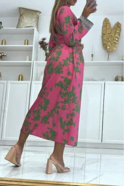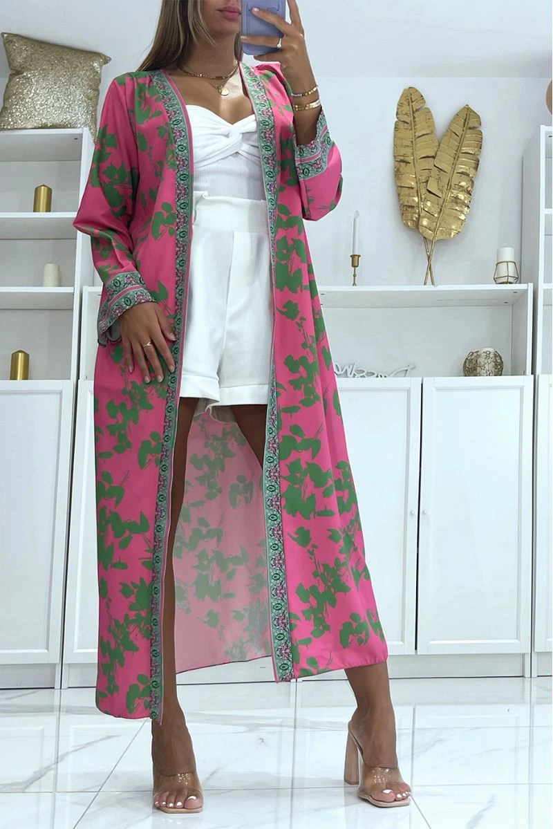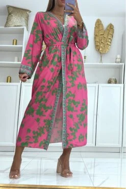 Sublime kimono en soie avec motif fuchsia et pistache