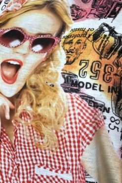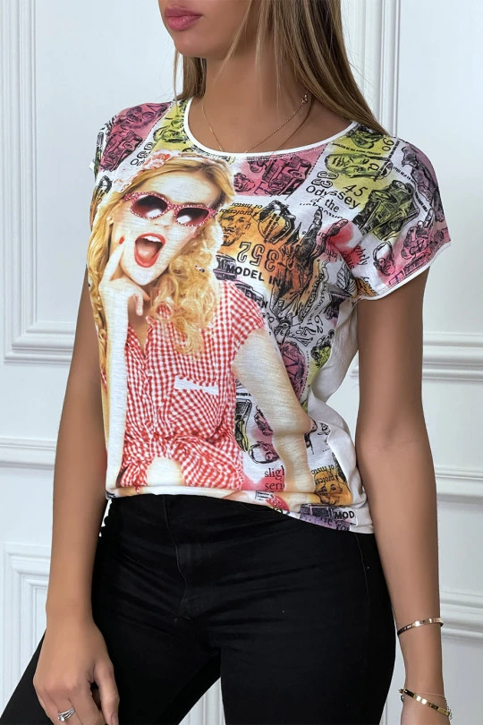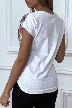 T-shirt blanc à motif femme vichy et strass contourné de fil argenté