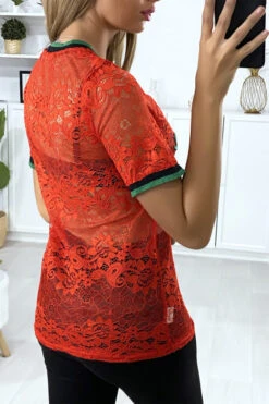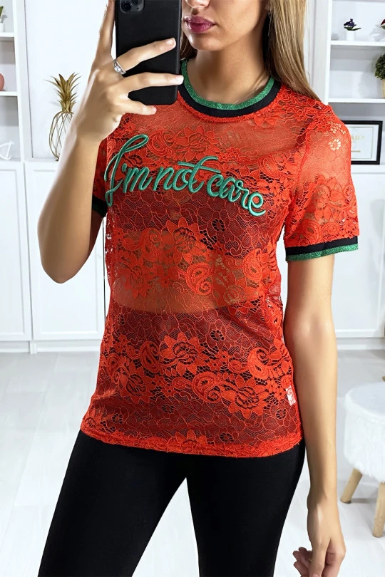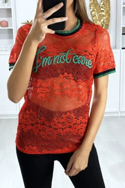 T-shirt en dentelle rouge pour femme avec écriture brodé. Mode femme pas cher
