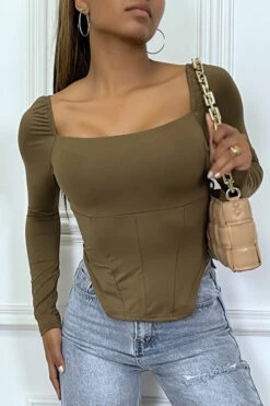 T-shirt Manches Longues Taupe à Style Corsé à Col Carré