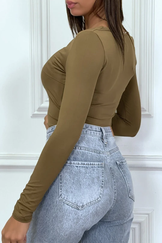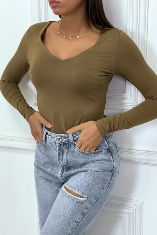 T-shirt moulant taupe à manches longues et à col v. Agréable et simple à porter ce haut est un basique à avoir dans sac garde robe.