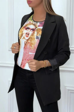 T-shirt noir à motif femme vichy et strass contourné de fil argenté