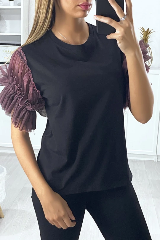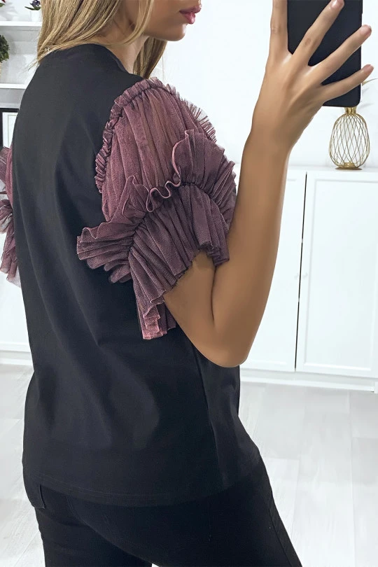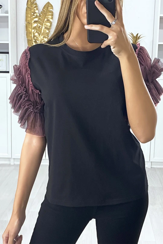 T-shirt noir pour femme avec manches en tulle lila. PrĂŞt Ă porter mode femme pas cherÂ