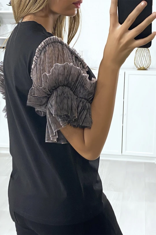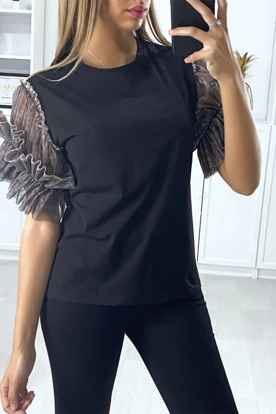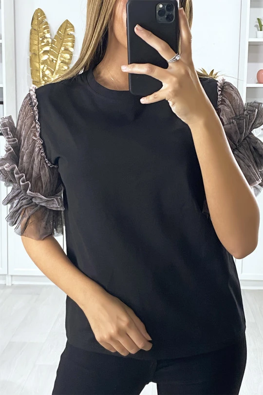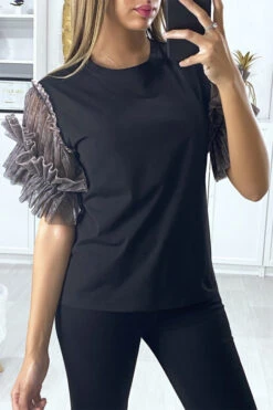 T-shirt noir pour femme avec manches en tulle taupe. PrĂŞt Ă porter mode femme pas cherÂ