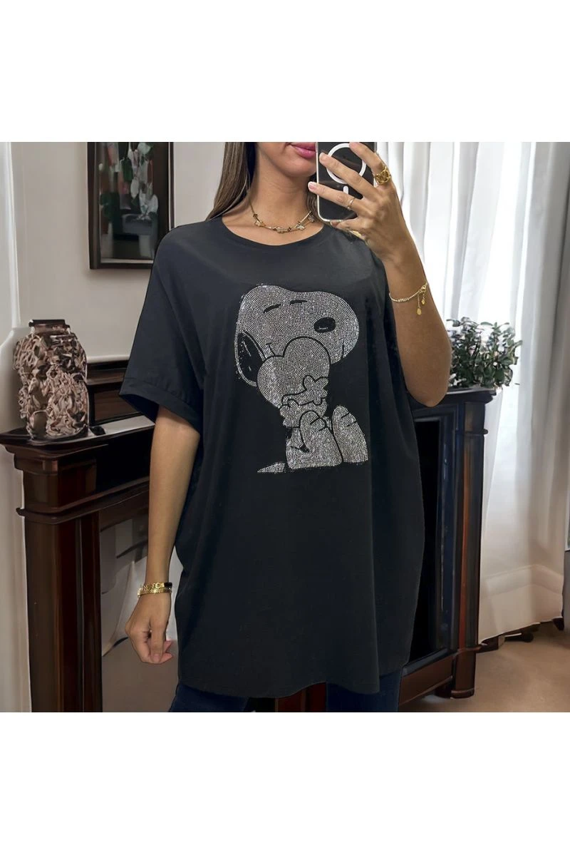 T-shirt noir en coton over size avec dessin en strass allant jusqu’au 52