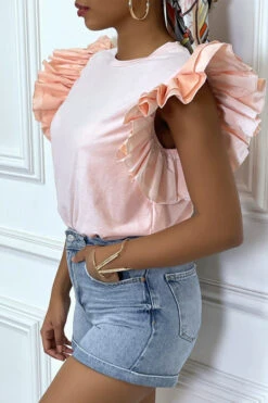 Magnifique t-shirt avec manches original matérialisées par 2 volants superposés qui donne de l’allure pour un effet ultra glamour. Son tissus T-shirt classique