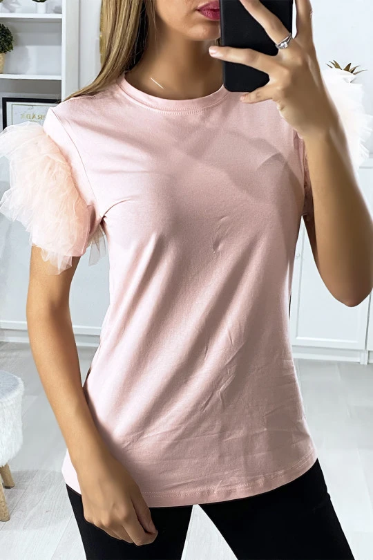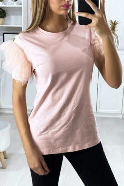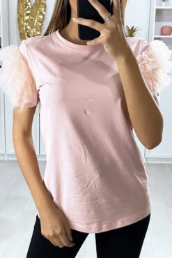 T-shirt rose pour femme avec manches froufrou en tulle. Mode femme pas cherÂ
