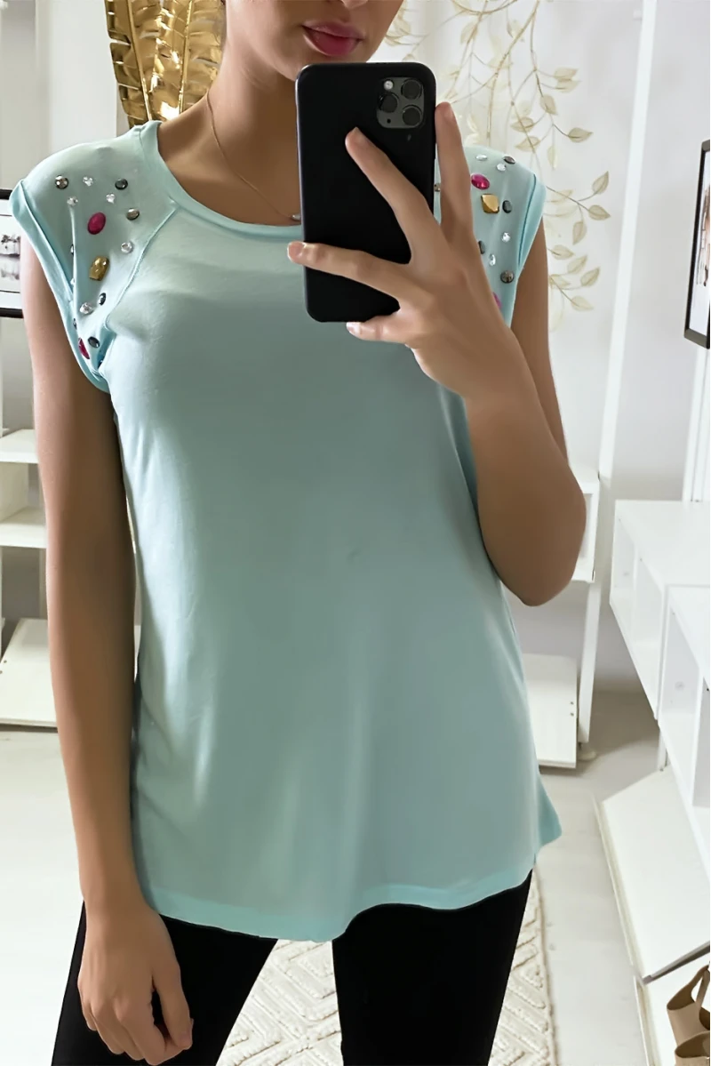 Joli T-shirt bleu aqua très chic avec de jolis strass aux Ă©paules. Mode pour femme tendanceÂ
