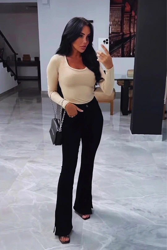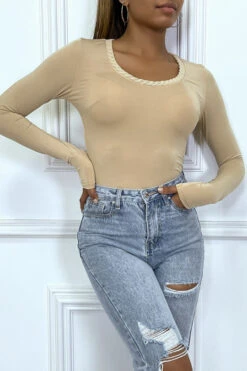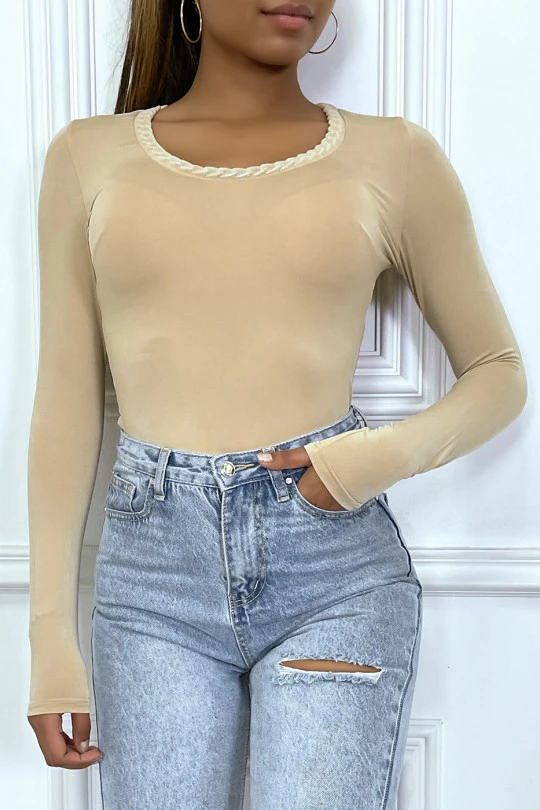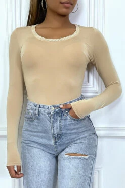 Tee-shirt beige à manches longues à col avec chaîne. Agréable à porter et simple à accessoiriser.