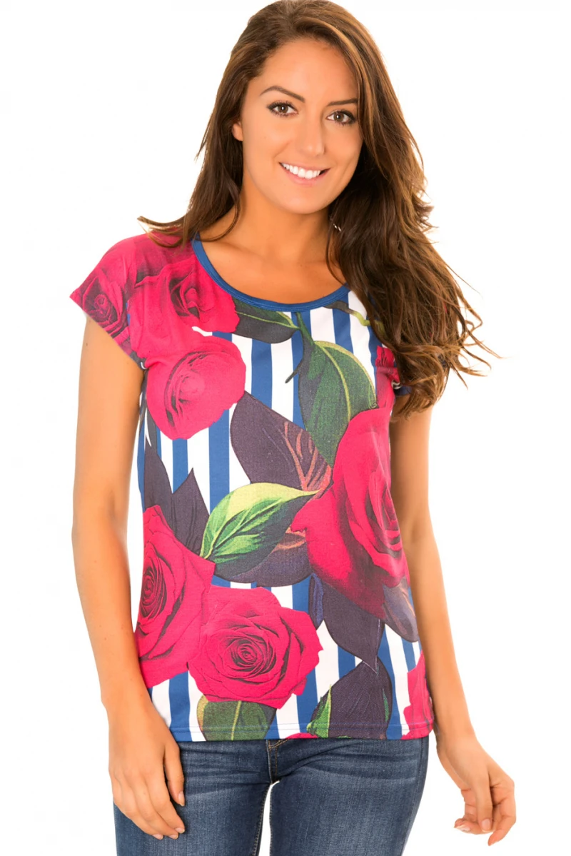Mega destockage Tee shirt fluide a rayure Bleu marine, Blanc a motif fleurs – MC1664
