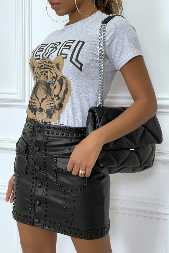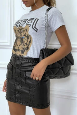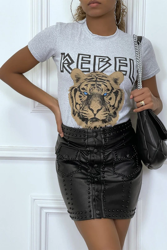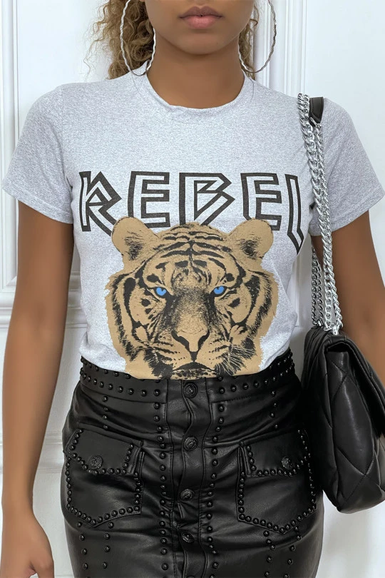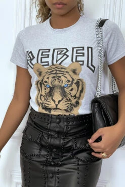 Tee-shirt gris cintrée avec écriture REBEL et tête de lion