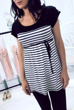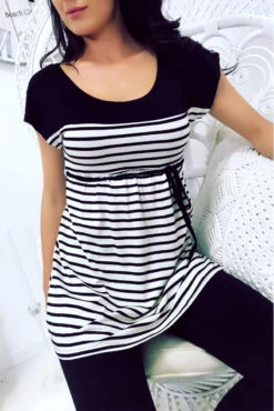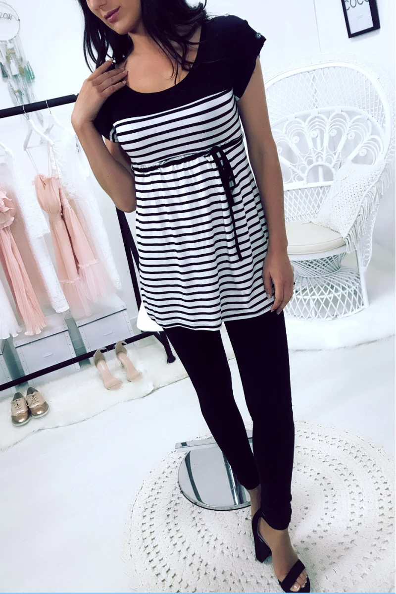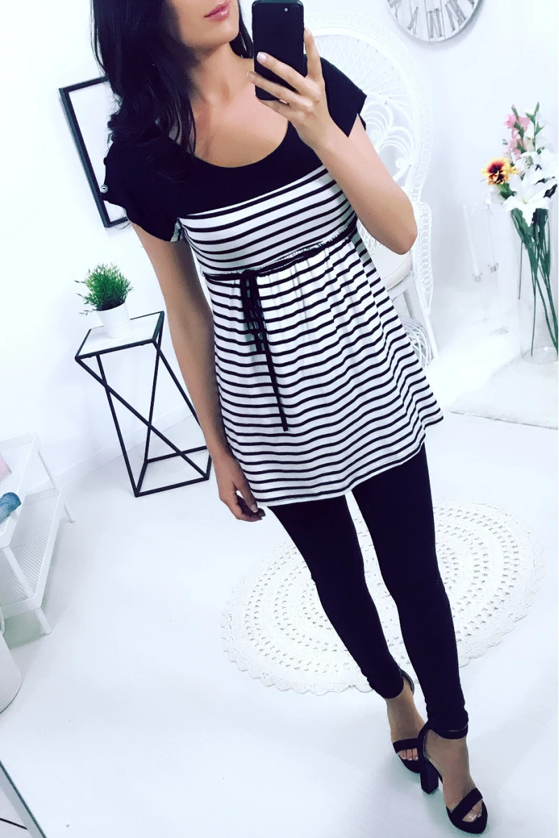 Vente Flash Tee Shirt long noir et blanc style mariniere, boutons sur les epaules et lien a nouer sous la poitrine.