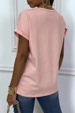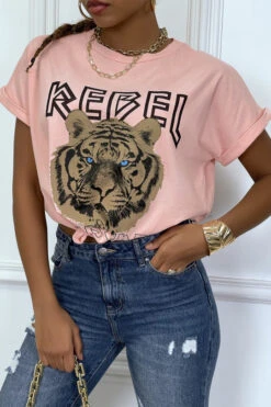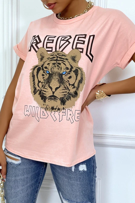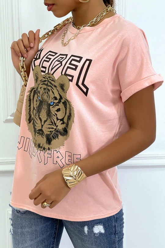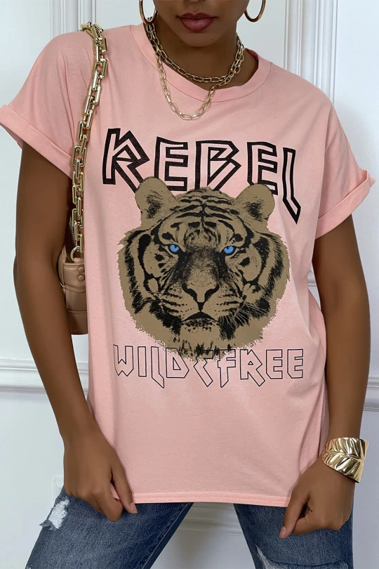 Tee-shirt rose ample avec écriture REBEL et tête de lion