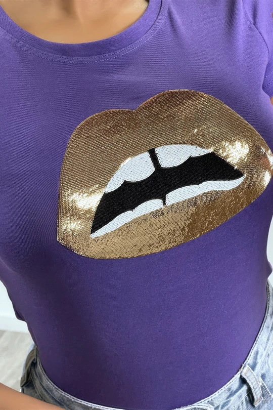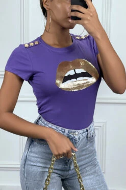Tee-shirt violet avec dessins et boutons dorée