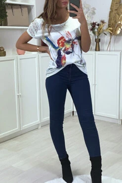 Teeshirt bleu fluide Ă dessin et epaules dentelles