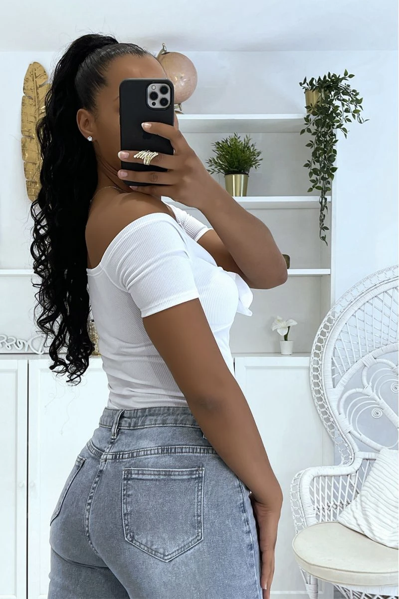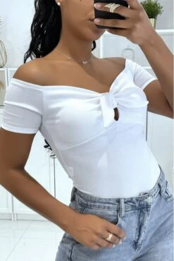 Top court blanc avec coque à la poitrine et joli noeud manches courtes et épaules dénudées