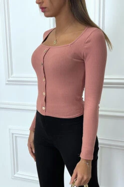 Top Rose Foncé Côtelé à Col Plongeant Et Boutons Dorés Fantaisies