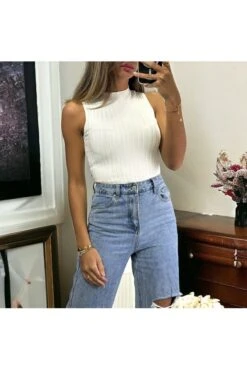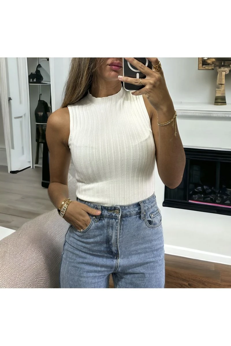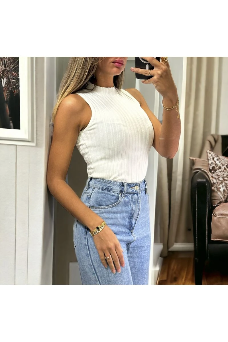 Top sans manche beige très extensible en col montant allant jusqu’au 46