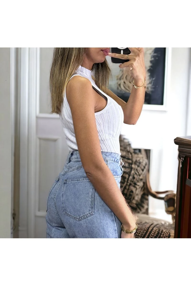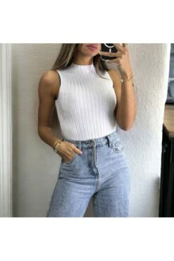 Top sans manche gris très extensible en col montant allant jusqu’au 46