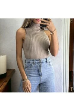 Top sans manche taupe très extensible en col roulé allant jusqu’au 46