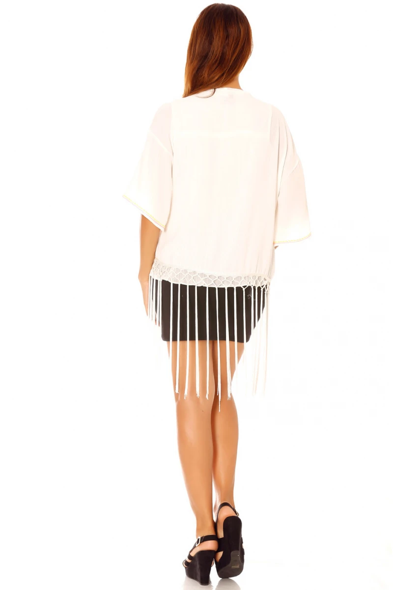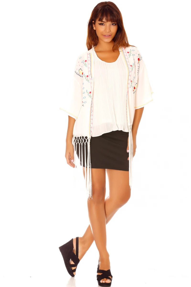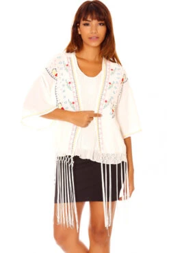Mega destockage Veste Kimono blanche a broderies et franges C902